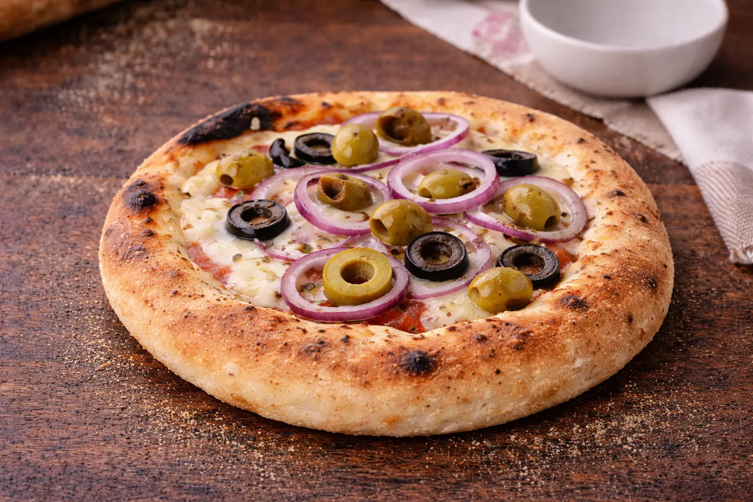 WEIZENMEHL, Wasser, Mozzarella Käse, Tomatensauce (Tomaten, Thymian, Basilikum, Olivenöl, Zucker, Salz), schwarze Oliven (schwarze Oliven, Salz, Konservierungsstoff Kalciumsorbat), grüne Oliven (grüne Oliven, Wasser, Salz, Zitrone, Citronensäure, Konservierungsstoff Kalciumsorbat), rote Zwiebel, grüne Zwiebel, Tomate, Salz, Olivenöl, Hefe, weißer Pfeffer, Thymian, Honig.